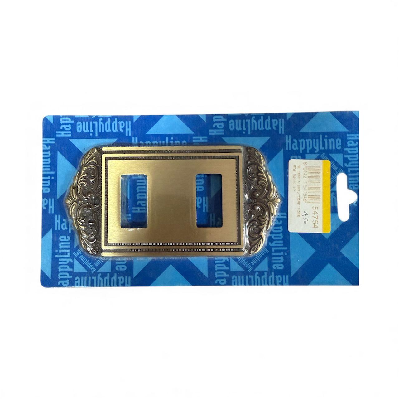 È una placca decorativa per interruttore della linea HappyLine in stile classico, con finitura ottone satinato centrale e bordi laterali lavorati a motivo floreale in metallo color bronzo anticato. La parte centrale è liscia e rettangolare, con un foro singolo per un tasto/interruttore, ma lo stesso design è disponibile anche nelle versioni a due e tre posti per montare più comandi nello stesso punto.